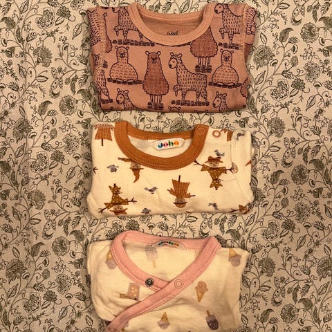 Babyklæri størrelse 56-62 i flerfargede toner. Pakken inneholder ulike plagg som passer til baby, blant annet heldresser og bukser/overdeler. Klærne er egnet til hverdagsbruk for både jente og gutt i spedbarnsalder.