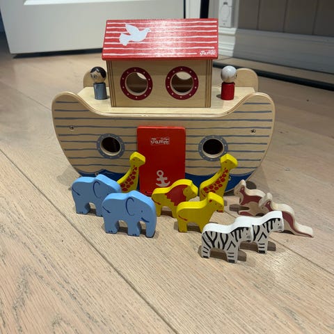 Noahs ark i tre med putteboks. Noen bruksmerker.
