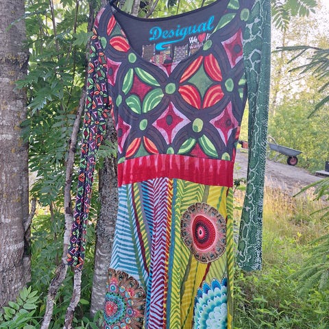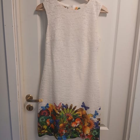 Desigual sommerkjole for dame i størrelse S. Kjolen er laget i bomull og har flerfarget mønster med karakteristiske Desigual-detaljer foran. Kortermet modell med markert liv og utsvingt skjørt. Passer til bruk på varme dager eller som en lett kjole til hverdags og fritid.