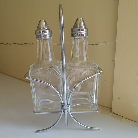 Vintage olje- og eddiksett i glass med metallstativ