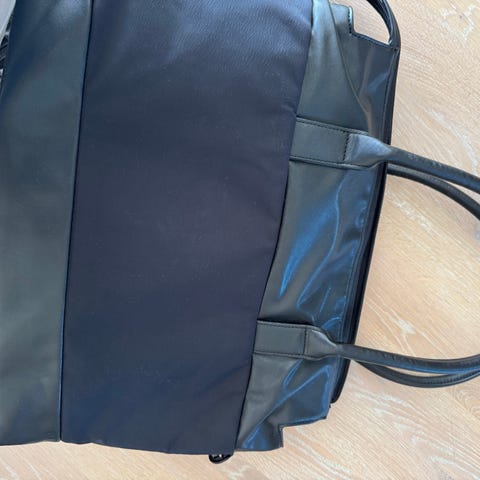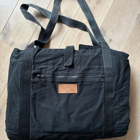 Ida Ising stelleveske i svart tekstil med brune skinnstropper. Vesken har glidelåslomme på utsiden og innvendig polstret stellematte som kan brettes ut. Innvendig er det flere elastiske lommer til bleier, flasker og annet utstyr. Lukkes med stropp og treknapp på toppen. Egnet som stelleveske til babyutstyr og kan bæres over skulderen.