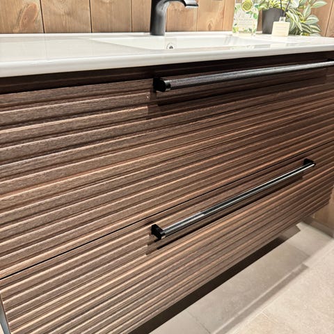 Linn Bad Emma baderomsmøbelpakke 160 cm med dobbelt servant i hvit overflate og underskap i treutførelse. Pakken består av servanttopp med to rektangulære nedfelte servanter, tilpasset to armaturer. Underskapet har flere skuffer og åpne hyllerom for oppbevaring av håndklær og baderomsartikler. Innvendige bokser i tre gir ekstra inndeling og organisering i skuffene. Møbelpakken er egnet for montering på vegg på baderom der det er behov for god oppbevaringsplass og to servanter på en 160 cm bred løsning.