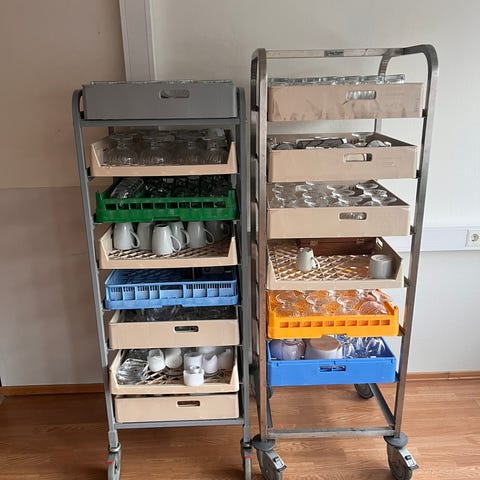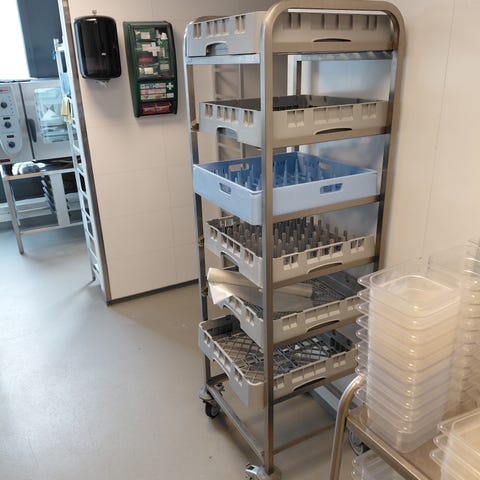 Flaskestativ for store vannkanner i metall, farge hvit. Stativet har flere hyller og er egnet for oppbevaring av liggende vannkanner, for eksempel til vanndispenser. Passer til bruk på kontor, lager, kantine eller hjemme der det er behov for organisert lagring av vannkanner.