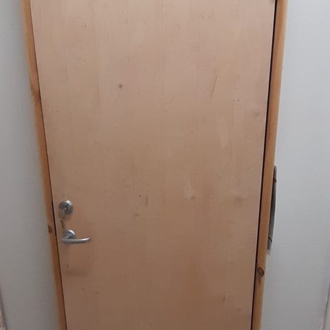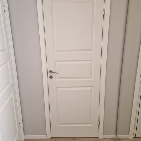 Dør i tre med karmer, mål med karmene: 159x69. i naturlig trestruktur. Døren har stående panel på den ene siden og glatt finer på den andre. Døra er ubrukt.