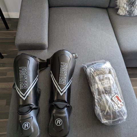 Booster boksehansker og Fighter leggbeskyttere i svart og grønn farge.