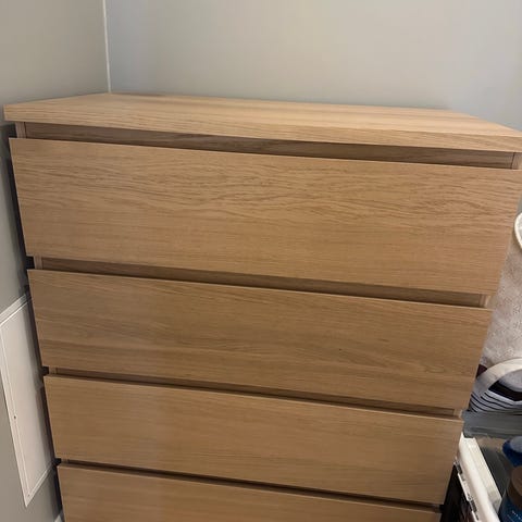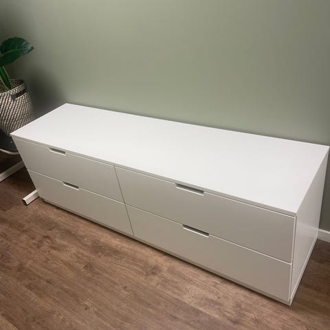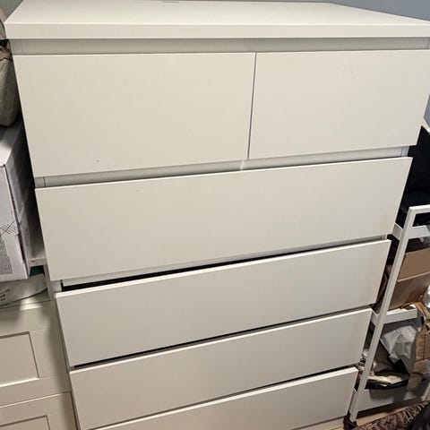 Malm kommode som er malt og en skuff som må fikses. Det er underflaten på skuffen som har falt ut av sporert, så den må fikses.
