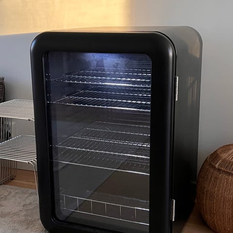 Sunwind vinkjøleskap i svart utførelse. Skapet har to soner, en dør og elektronisk betjening i front av døren (se bilde). Innvendig er det flere hyller med bølgeformede trådstativ til vinflasker. Ytterdøren har glassfelt som gir innsyn til flaskene. Baksiden har ventilasjonsåpninger og vifter for luftsirkulasjon. Egnet for oppbevaring og temperering av vin og andre drikkevarer. Mål: Bredde 34,5 cm . Dybde 48,5 cm. Høyde 65,5 cm. Skapet er lite brukt, og har stått lagret en del år. Kan leveres på strekningen Fagernes-Gjøvik-Jessheim-Hønefoss-Oslo hvis det passer med annen kjøring, uten ekstra kostnad.