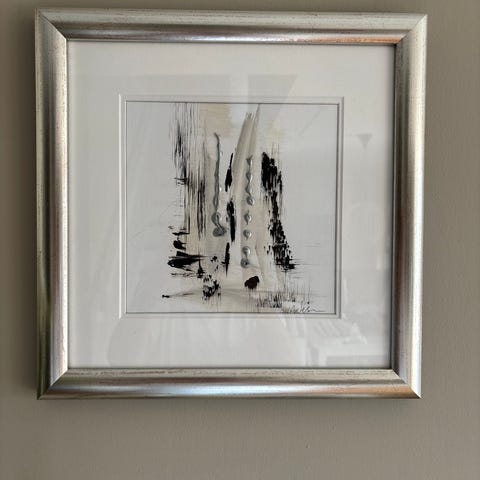 Kjent kunstner fra Sandnes. Abstrakt maleri på hvit kartong, dimensjon 54x37 cm. Uten ramme. Motiv i moderne, non-figurativ stil. Passer som veggdekor i stue, soverom eller kontor.