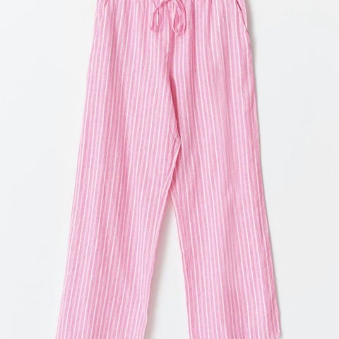 Gina Tricot bukse for dame i størrelse L. Buksen er i lin og kommer i en lys lilla farge. Den har strikk og snøring i livet samt sidelommer. Passer til hverdagsbruk og avslappede anledninger.