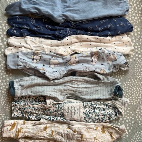 Selger klespakke med tre pent brukte pysjamas til baby i størrelse 62. Alle er brukt av ett barn og uten hull. To er fra Kapphal, mens en er fra Reflex.
