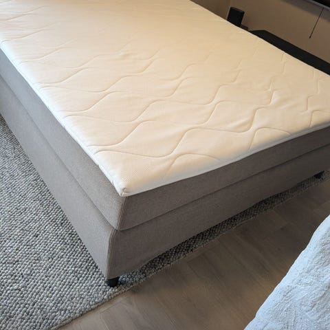 Overmadrassen (Dreamzone T80) ble kjøpt i juli 2024 (kvittering finnes). Den er helt uten flekker.