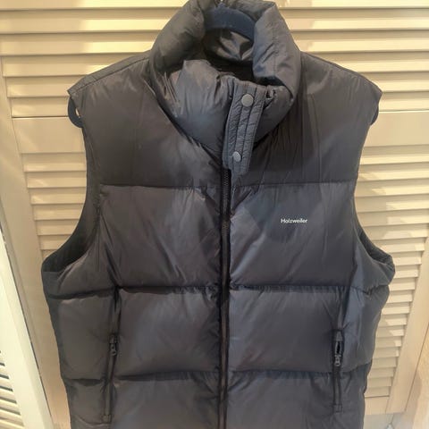 Holzweiler dunvest for herre i størrelse XL. Vesten er blå og fylt med dun, med glidelås i front og høy krage. Yttermaterialet er glatt og egnet til bruk som ytterplagg eller som et ekstra isolerende lag. Passer til hverdagsbruk og utendørsaktiviteter i kjøligere vær.