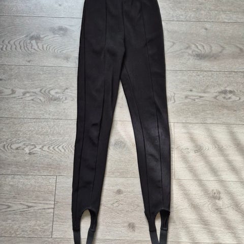 Buksen er svart og laget i viskoseblanding med stretch, noe som gir en tettsittende passform. Foran er det dekorative glidelåslommer med metallglidelås.