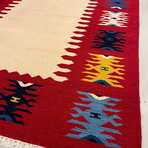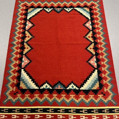 Røllakan teppe solgt på Ikea med navnet Tranget. Det har noen små flekker som ikke er forsøkt fjernet, og man må lete litt for å finne dem. Ikke veldig sjenerende. Ingen vond lukt. Teppet er litt tynnere enn tradisjonelle Röllakan tepper. 5-6mm.