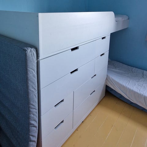 Både sengen og trofast kommoden har fått noen riper ved flytting, så ett nytt strøk vil gjøre seg.