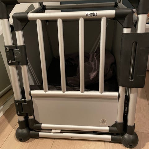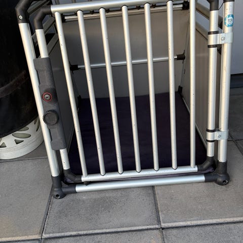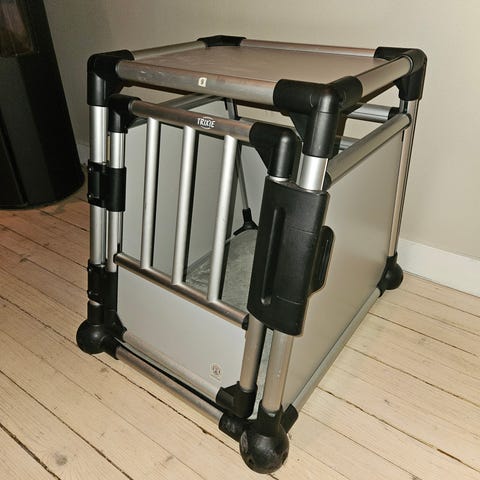 Hundebur med størrelse 60 x 66x 51. Inne i buret ligger en enkel pute/bunn. Noen bruksmerker. Smurt lås med låseolje da den begynte å være noe treg, funket fint igjen etter smøring. Brukt til en Bichon havanais hvor han hadde veldig god plass til å snu seg og endre liggestilling.
