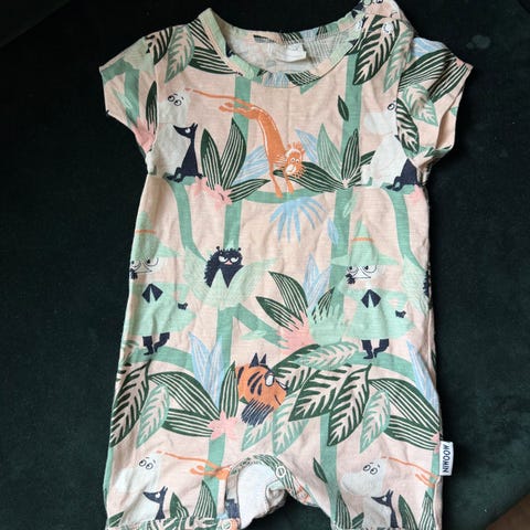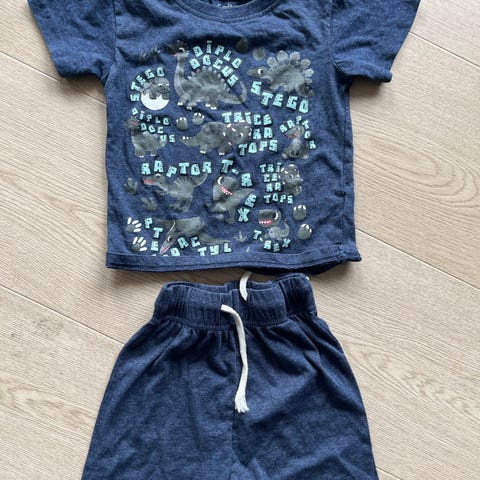 Sett i myk bomull med flerfarget dyreprint på mørk bunn. T‑skjorten har kort erm og rund hals. Shortsen har strikk og snøring i livet samt lommer i siden. Unisex‑modell egnet til hverdagsbruk og lek.