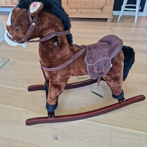 Gyngehest med sete i mykt, rosa stoff og lyse detaljer. Hesten har tremeier og håndtak for barnet å holde seg i. Det kommer lyd når man trykker på ørene. Setet er polstret og gir støtte rundt ryggen. Egnet som leke for små barn som liker å gynge og sitte stødig. Passer til innendørs bruk på jevnt underlag.