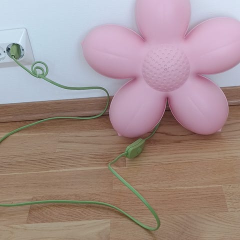 IKEA blomsterformet vegglampe i rosa plast. Lampen er formet som en blomst med seks kronblad og har lysenhet og ledning med bryter på kabel. Egner seg som vegglampe på barnerom eller lekerom for myk belysning. Bruker pære med standard sokkel i henhold til merkingen på lampen.