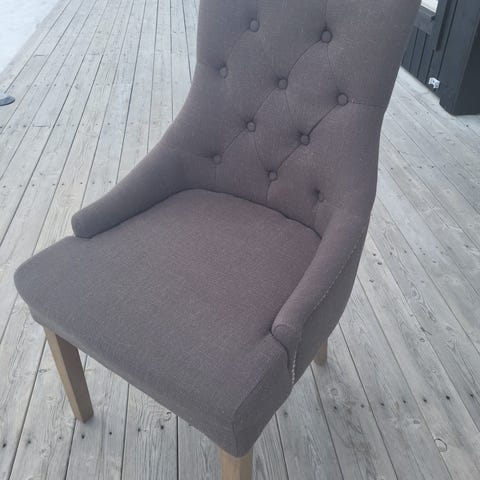 Selger 8 stk elegante spisestuestoler i grått stoff med mørke treben. Stolene har et tidløst design med knapper i ryggen og et praktisk dekorhåndtak på baksiden som gjør dem enkle å flytte på.
