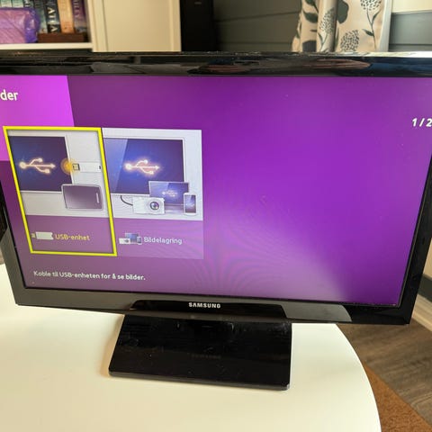 Samsung 22»TV med tilhørende veggfeste. Skjermen har tilkoblingsmuligheter på baksiden, blant annet HDMI, komponent, kompositt og VGA. Veggfestet som følger med har innebygd vater for enkel montering. Egner seg som TV eller ekstern skjerm i stue, soverom eller kontor, avhengig av behov og kompatible enheter som kobles til via tilgjengelige innganger.