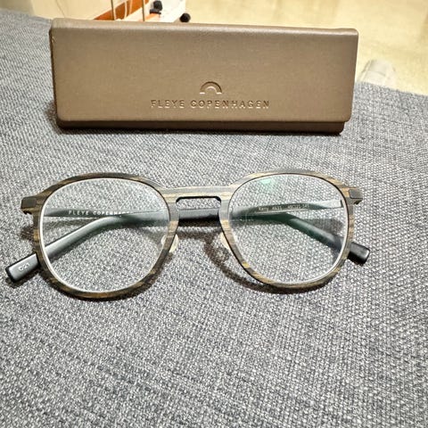 Fleye briller unisex med rund innfatning. Innfatningen har en rødlig/brunlig.front med mørke stenger og er egnet for både kvinner og menn. Brillene leveres med etui som vist på bildene. Er styrke i glassene. De kan lett tas ut og byttes hos optiker til ønsket styrke.