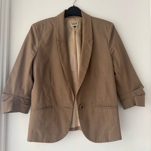 River Island lett jakke i størrelse 12/ tilsvarer S/ M. Jakken er beige og laget av 100 % viskose. Modellen har dyp utringning med slag, to dekorative knapper foran og lange ermer. Passer til bruk over topp, skjorte eller kjole i hverdagen eller til mer pyntede anledninger. Lukkes med hektelukning i front.