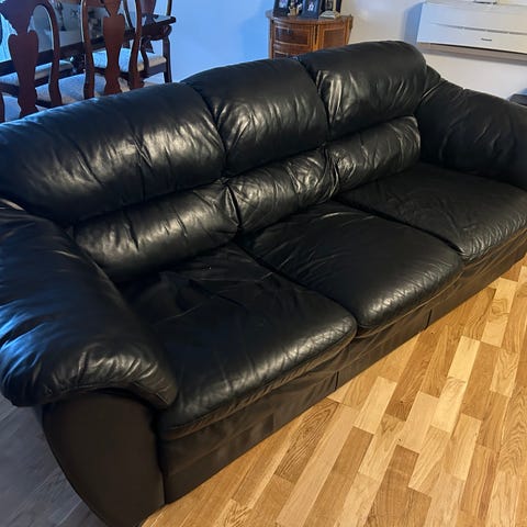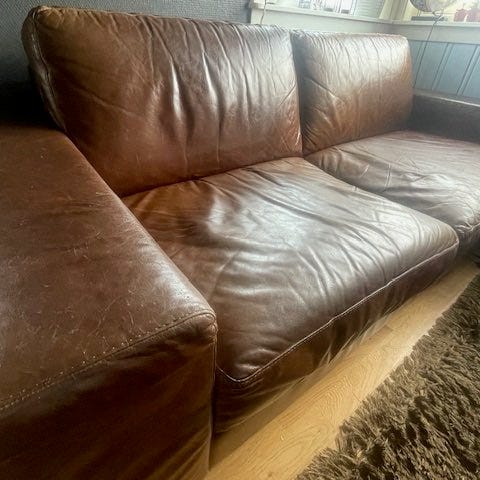 Sofaen er hel, stabil med noe bruksslitasje etter alder. Dette inkluderer noe misfarging på én ryggpute, samt to små og nesten usynlige sprekker i skinnet på siden av én sittepute.