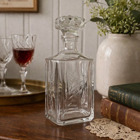 Sett med karaffel og små glass i klart glass med motivdekor i ulike farger. Karaffelen har rund form med smal hals, og glassene er lave med trykk av bygninger og landskap. Egner seg til servering av brennevin eller andre drikker i små porsjoner, og kan også brukes som dekorativt innslag på kjøkken eller i vitrineskap.
