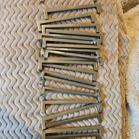 Vi har totalt 20 skålhåndtak og knotter i mørk børstet messing. Ti av hver. Klassisk og i super stand, med skruer til de fleste. Fra et eldre Sigdal Herregård kjøkken.