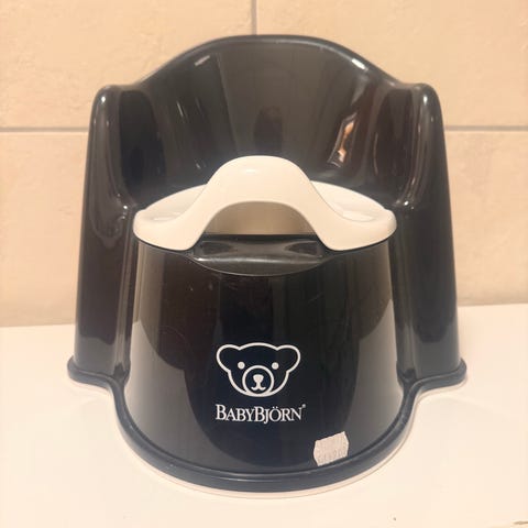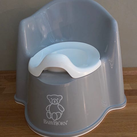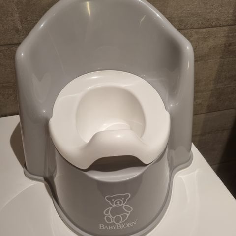 BabyBjörn potte og toalettsete i plast, i fargene blå og hvit. Potten har avtagbar innerskål for enkel tømming og rengjøring. Toalettsetet legges oppå vanlig toalettsete for å gjøre åpningen mindre og mer tilpasset barn. Egnet til bruk ved do- og pottetrening av barn.