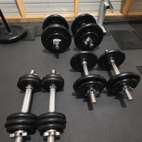 Vektskiver med curlstang og manualer selges billig. Noe rust på 3-4 vektskiver
