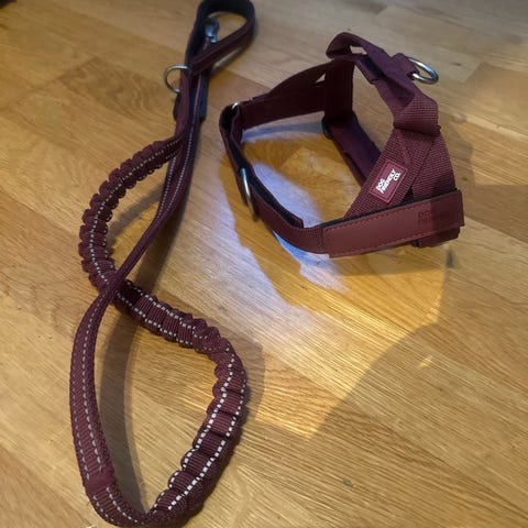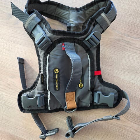 Helt ny, prøvd på. Bånd feste både på ryggen og på brystet, så kan brukes som spor sele. Norskprodusert sele med god kvalitet, men blir som du ser dessverre for kort i lengden til min lille setter. Svært justerbar rundt halsen og magen. Størrelse XS