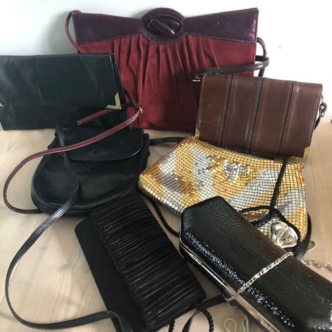 Jeg selger mange forskjellige skinnvesker, flesteparten er arv fra min veskeglade tante i Stockholm. Jeg har også lagt ved mine egne impulskjøp av vesker, som bare har ligget oppbevart i skap og skuffer.