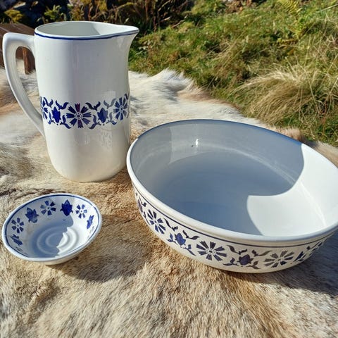 Egersund vaskesett bestående av mugge, vaskefat og lite skålformet fat. Settet er i hvitt porselen med blå dekor. Muggen har helletut, og vaskefatet er rundt og dypt. Det lille fatet kan brukes til såpe eller småting. Egnet som tradisjonelt vaskesett eller som dekorativt innslag på bad, soverom eller i gang. Merket Egersund under delene.