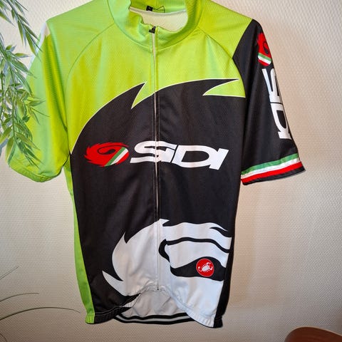 Sidi sykkelsett bestående av kortermet sykkeltrøye og bibshorts. Sett i teknisk materiale med kroppsnær passform. Trøyen har hel glidelås i front, kort erm og flere lommer på ryggen. Bibshortsen har seler i mesh-materiale og elastiske benavslutninger. Fargekombinasjon hovedsakelig svart med gule og hvite detaljer samt Sidi-logoer. Egnet til landeveissykling og trening i varmt vær.