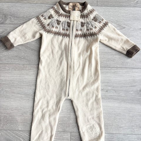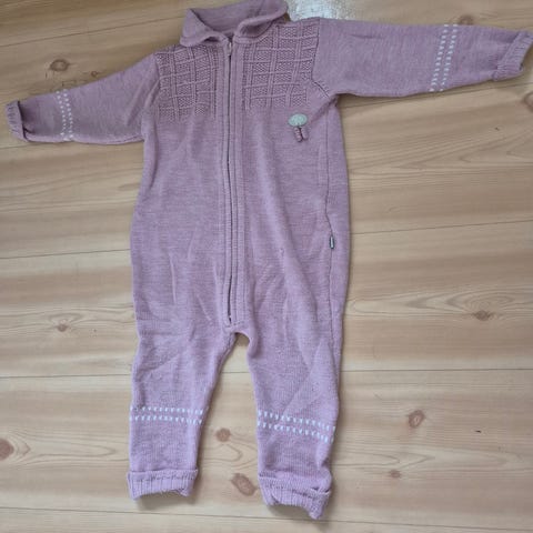 MeMini ullpysj for jente i størrelse 62. Heldress i rosa merinoull med mønster øverst på bryst og ermer. Glidelås i front og kontrastkanter ved hals, ermer og ankler. Myk og varm heldress som kan brukes som pysjamas eller innerlag på kjølige dager. Ps lite hull helt øverst, se bilde.