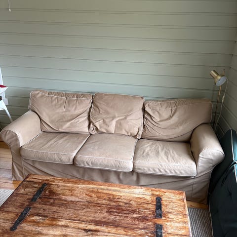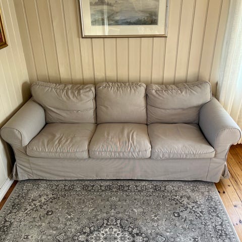 Gis bort idag til første som kan hente. Meget pent brukt IKEA Ektorp 3 seter. Hel og pen uten flekker eller feil. Trekkene kan taes av og vaskes. Ta med bærehjelp.