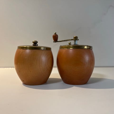 Salt- og pepperbøsser laget av mørkt tre. Disse bøssene har en klassisk, avrundet form med flere riller langs kroppen og metalldeksel på toppen med hull formet som bokstavene "S" og "P".