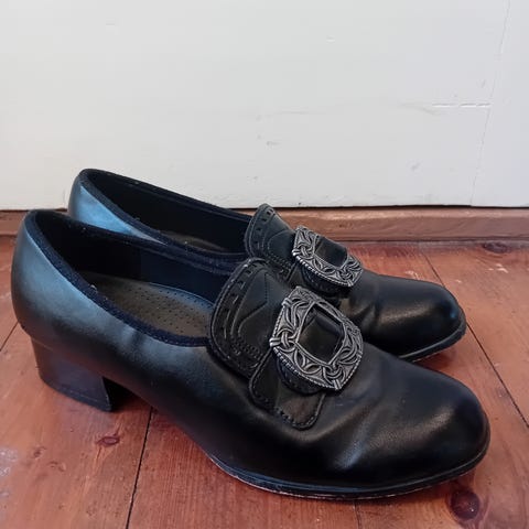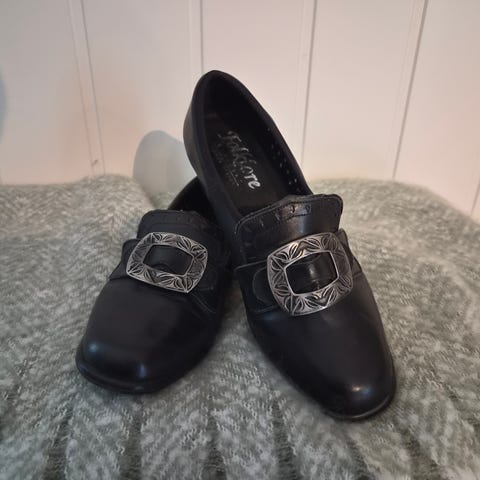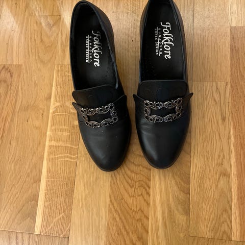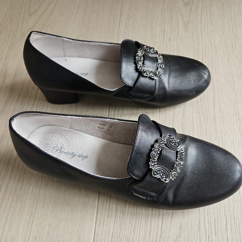 Flotte sko til bunad eller festdrakt av merket Bjørgvin. Skoene fremstår som svært pent brukt, ingen sår eller større merker. Flotte spenner og røde detaljer foran.
