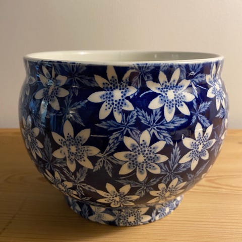 Kjempefin blåmalt pyntepotte . Oval - 25 x 35 cm. Høyde 15 cm