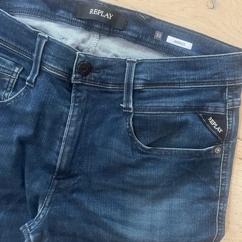 Pent brukte Replay jeans. Selges pga dei er for små. Men veldig behagelige og gå i og sitter fint. Strl: lengde-32 vidde-33