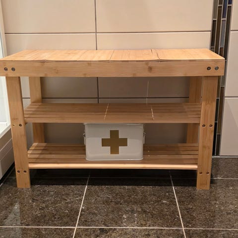 Håndlaget sittebenk med 4 skohyller. Solid. Selges pga oppussing.