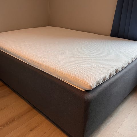 Selges billig nå på grunn av flytting.Kjøpt ny for 4 år siden hos trademax for 48000kr det er en Stor seng 210/210 Kontinentalseng i svart tekstiltrekk. Sengen har todelt underdel og overmadrass på toppen. Passer som fast sengeløsning på soverom eller gjesterom. Står på lave ben og krever madrass og sengetøy tilpasset sengens størrelse.