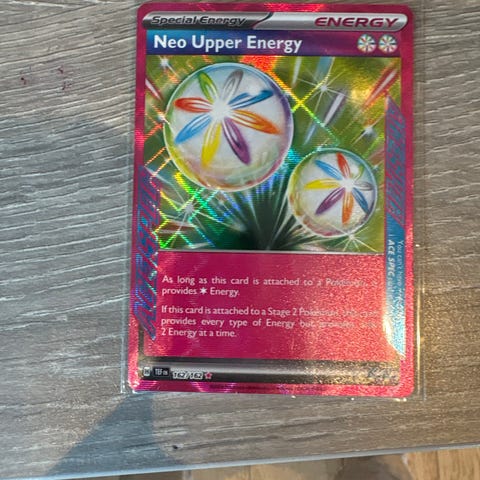 Pokémon Neo Upper Energy samlekort. Holofoil energikort fra Pokémon Trading Card Game. Motivet viser Neo Upper Energy med flerfargede energisymboler på rosa bakgrunn. Standard størrelse Pokémon-kort med trykk på begge sider, beregnet for bruk i Pokémon TCG-spill eller som samleobjekt. Eventuell tilstand og utgave kan vurderes nærmere ut fra bildene. Komt rett ifra pakken