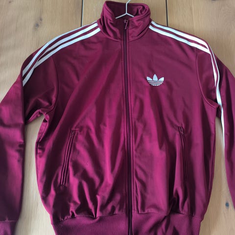 Adidas Originals treningsjakke for herre i størrelse M. Jakken er grønn med kontrastfargede striper langs ermene og Adidas-logo på brystet. Modellen har høy krage, hel glidelås i front og ribbestrikkede mansjetter og linning. Egnet som trenings- eller fritidsjakke.