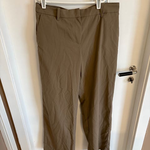 Zara bukser for dame i størrelse M. Buksen er grå og laget i lin og lyocell. Klassisk modell med beltehemper og sidelommer. Passer til hverdagsbruk og enkle, pene antrekk.