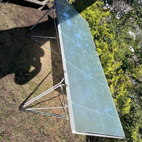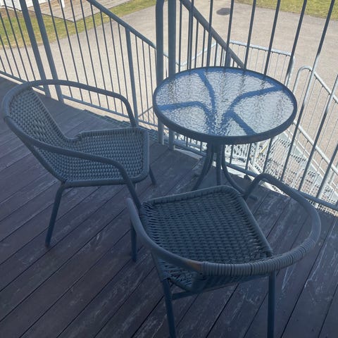 Bordene er i metall med glassplate og dekorativ kant. De er brukt, men fortsatt fullt brukbare. Litt værpreg etter å ha stått ute, men ingen store skader.