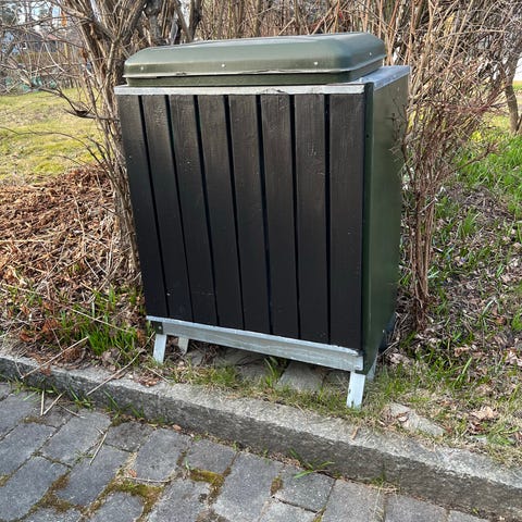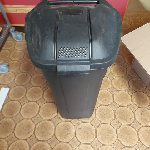 Plast søppeldunk med lokk og hjul i grå farge. Dunken har integrert håndtak og to hjul som gjør den enkel å trille. Egnet til oppbevaring eller avfallshåndtering utendørs, for eksempel i hage eller gårdsplass. Lokket kan åpnes helt opp for enkel tilgang til innholdet. Laget i hard plast som tåler normal utendørs bruk.