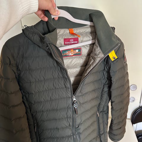 Den har høy krage, glidelås i front og sidelommer med glidelås. Typisk Parajumpers-detalj med gul stropp ved halsen og logo-patch på ermet. Egnet som lett ytterjakke i kjøligere vær. Glidelåsen er byttet ut, se bilde 6/9.
